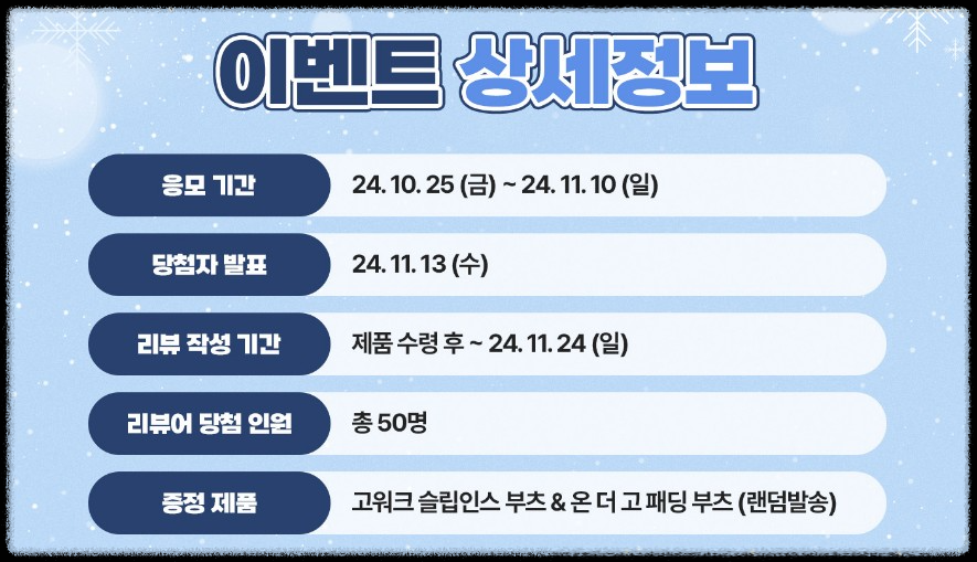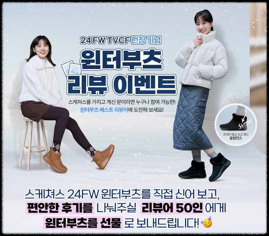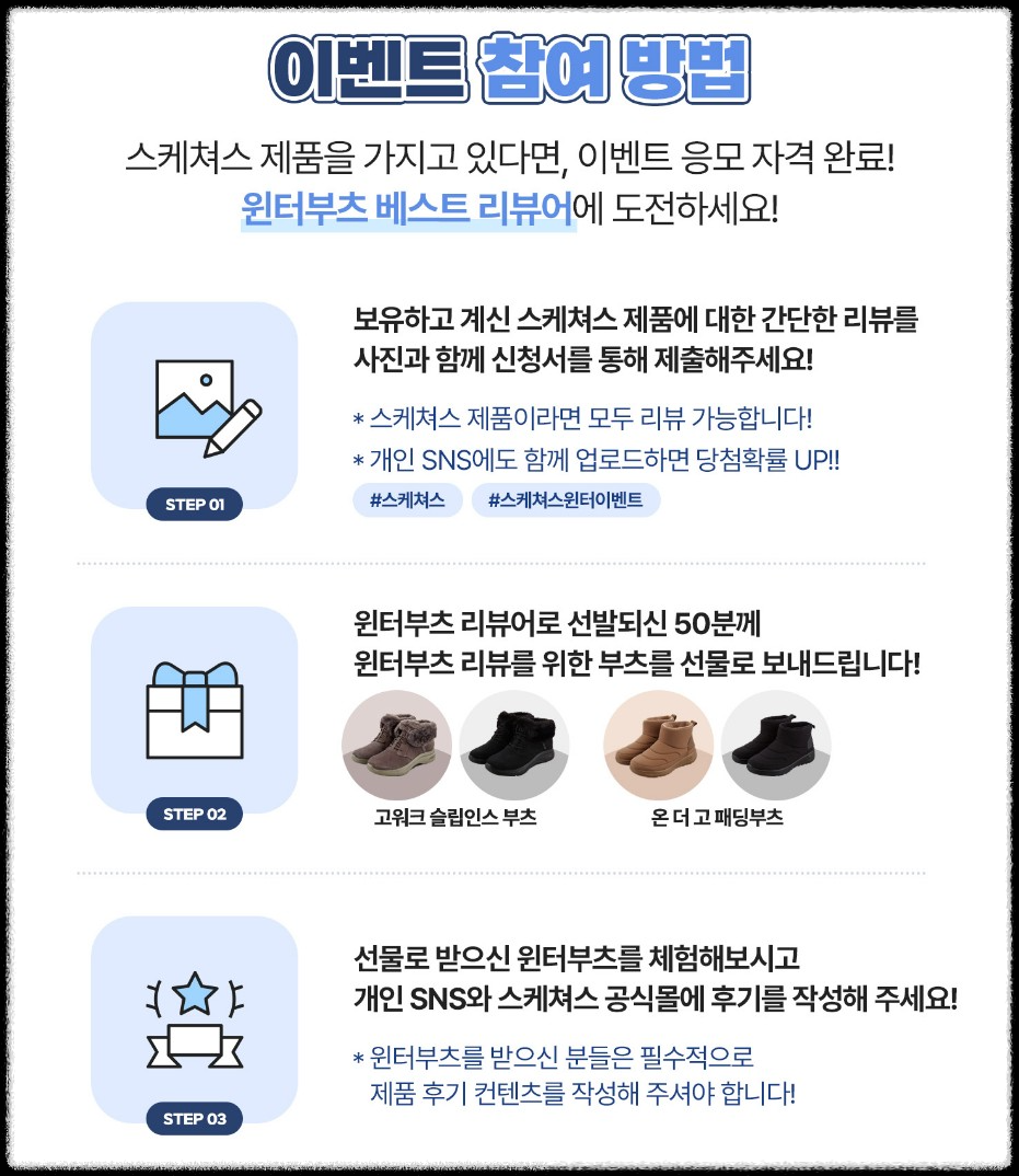 스케쳐스에서 윈터부츠 리뷰 이벤트를 진행하고 있습니다. 응모 자격은 스케쳐스 제품을 사용 중이신 분이라면 누구나 참여가능하니 관심 있으신 분들은 응모해 보시기 바랍니다.